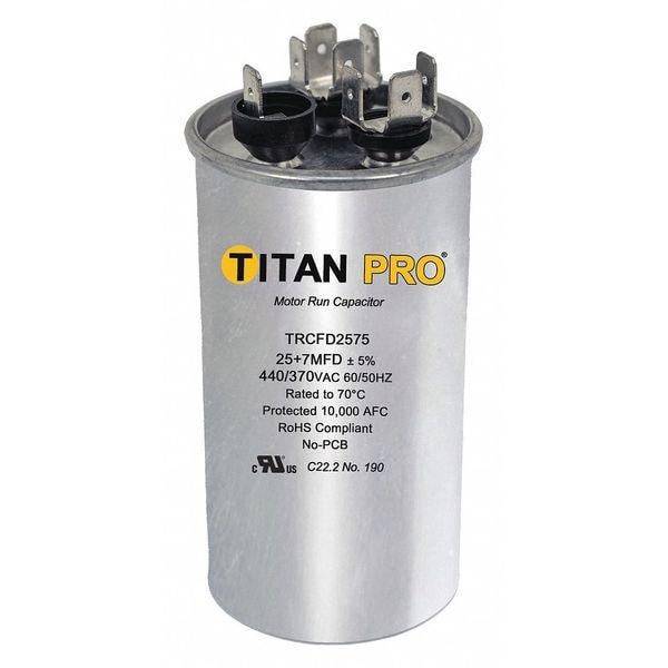 Motor Dual Run Capacitor, Dual Run Capacitor, Round, 440/370V AC, Microfarad Rating 25/7.5 MFD, Overall Height 4 1/4 in, Case Material Aluminum