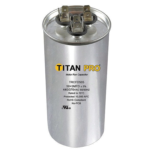 Motor Dual Run Capacitor, Dual Run Capacitor, Round, 440/370V AC, Microfarad Rating 50/5 MFD, Overall Height 4 7/16 in, Case Material Aluminum