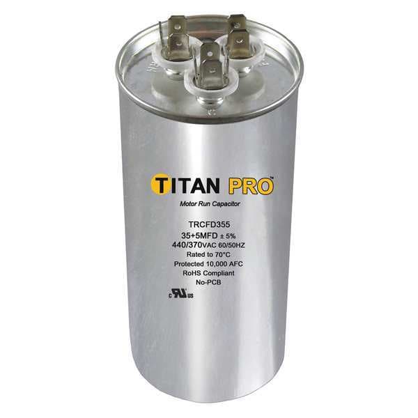 Motor Dual Run Capacitor, Dual Run Capacitor, Round, 440/370V AC, Microfarad Rating 50/7.5 MFD, Overall Height 4 7/16 in, Case Material Aluminum