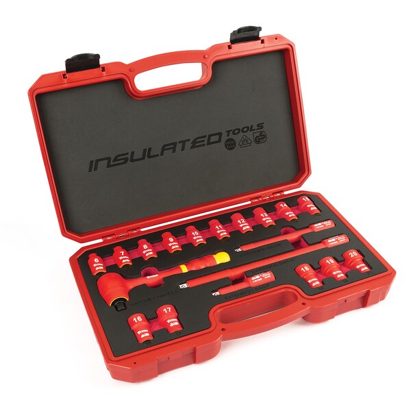 Fully insulated 3/8 inch drive with reversible ratchet and quick release, (15) 6 Point Sockets: 6, 7, 8, 9, 10, 11, 12, 13, 14, 15, 16, 17, 18, 19, & 20 mm, (3) Extensions: 3, 6, & 10 inch, storage case