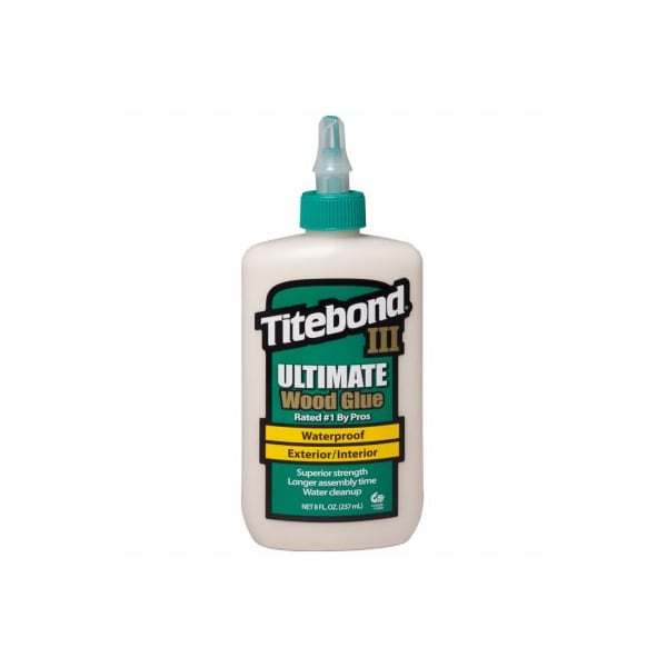Titebond III, 8 OZ, Ultimate Wood Glue, Bonds Porous Wood Wood Type Materials, Strong Initial Tack, Superior Strength, Long Open Assembly Time, Sandable, Low Application Temperature, NonToxic, Solvent Free, Water Clean Up, Unaffected By Finishes, Meets ANSIHPVA Type I Water Resistance Specification, FDA Approved For Indirect Food Contact, InteriorExterior