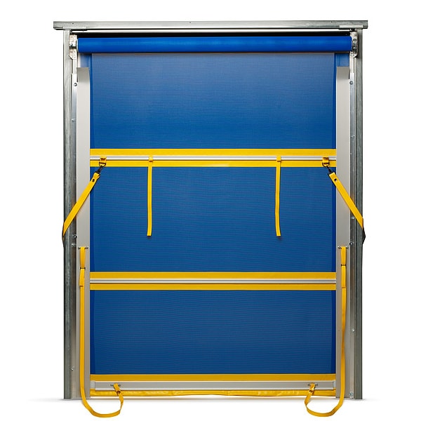 Item Curtain Door, Curtain/Door Material 11 oz PVC Mesh, Curtain/Door Operation Spring Assist Roll Up, Opening Height 9 ft, Opening Width 8 ft, Height 9 ft, Width 8 ft, Curtain/Door Mounting Under Header Mount, Color Blue, Yellow, Includes Screen Panels, Standards AIB, FDA, Wind Load Rating Not Rated for Wind