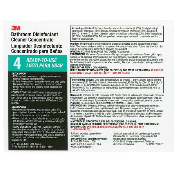 Secondary Bottle Label, Height 11 in, Width 8 1/2 in, Material High Gloss Paper, Compatible Grainger Part Number 3KMA3, Compatible Mfg. Model Number 130296, Legend 3M Bathroom Cleaner Ready-to-Use 4, Package Quantity 12