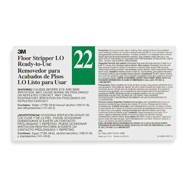 Secondary Bottle Label, Height 11 in, Width 8 1/2 in, Material High Gloss Paper, Compatible Grainger Part Number 3KMA3, Compatible Mfg. Model Number 130296, Legend 3M Floor Stripper L0 22, Package Quantity 12