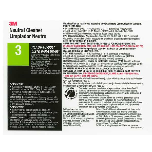 Secondary Bottle Label, Height 11 in, Width 8 1/2 in, Material High Gloss Paper, Compatible Grainger Part Number 3KMA3, Compatible Mfg. Model Number 130296, Legend 3M Neutral Cleaner 3, Package Quantity 12