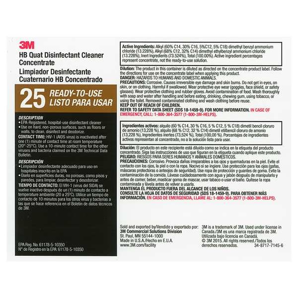 Secondary Bottle Label, Height 11 in, Width 8 1/2 in, Material High Gloss Paper, Compatible Grainger Part Number 3KMA3, Compatible Mfg. Model Number 130296, Legend 3M HB Quat Disinfectant Cleaner 25, Package Quantity 12