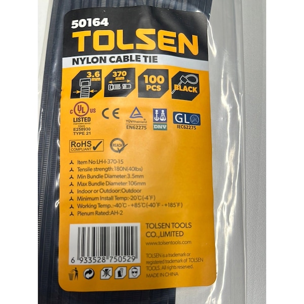14.5/370mm x 3.6mm Zip TieTensile Strength: 180N40lbsMin Bundle Diameter: 3.5mmMax Bundle Diameter: 106mmRated For Outdoor Use