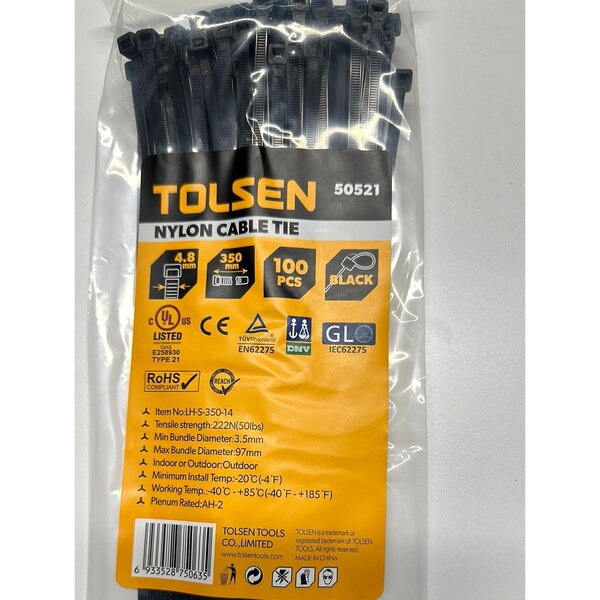 14/350mm x 4.8mm Zip TieTensile Strength: 222N50lbsMin Bundle Diameter: 3.5mmMax Bundle Diameter: 97mmRated For Outdoor Use