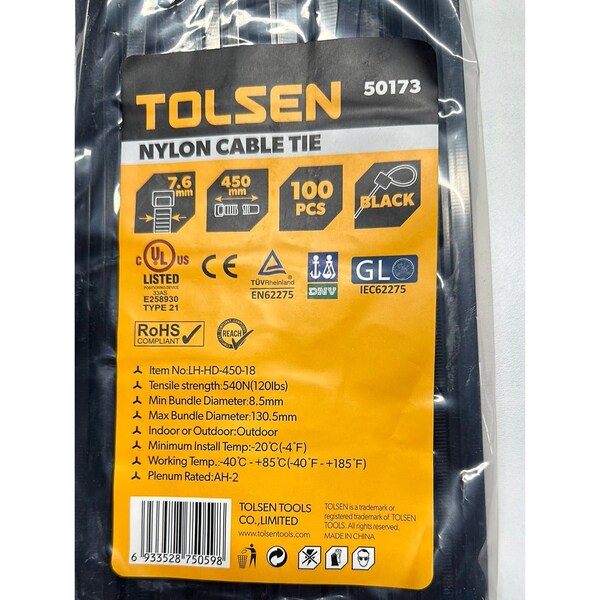 17.5/450mm x 7.6mm Zip TieTensile Strength: 540N120lbsMin Bundle Diameter: 8.5mmMax Bundle Diameter: 130.5mmRated For Outdoor Use