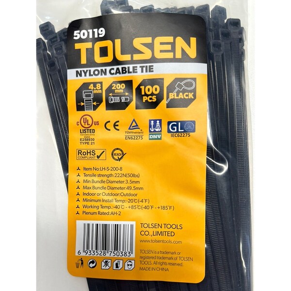 8/200mm x 4.8mm Zip TieTensile Strength: 222N50lbsMin Bundle Diameter: 3.5mmMax Bundle Diameter: 49.5mmRated For Outdoor Use
