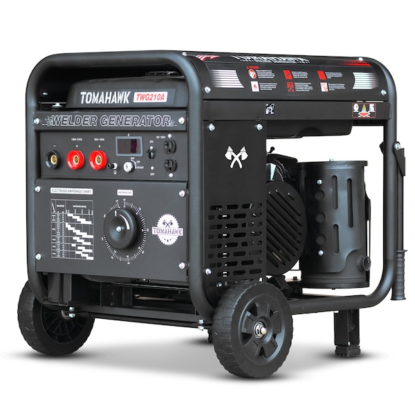 The Tomahawk TWG210A Generator / Welder is designed for high power and durability. Ideal for farms, construction sites, or any job that requires electrical power and CC (constant current) stick welding. Producing up to 210 Amps of DC output with a 60% duty cycle, it is suitable for welding from 6010 rods up to 7024 rods. Convenient back wheels allow for maneuverability for portable onsite welding and can also be used for emergency back-up power when necessary. Featuring Tomahawk’s incredible 15HP engine, with 2000 watts of DC output, this welder generator will provide you with the power you need wherever you need it. The Tomahawk TWG210A is an excellent tool for job applications at your workshop, ranch, or farm - and is backed by a 2-year engine warranty.