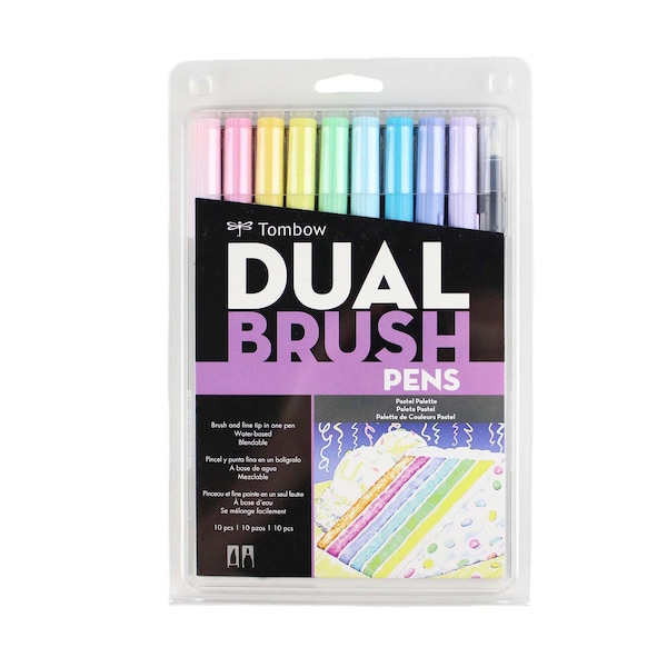 Set of 9 colors with colorless blender pen. Flexible brush tip and fine tip in one marker. Brush tip works like a paintbrush to create fine, medium or bold strokes; fine tip gives consistent lines. Dual Brush Pens are ideal for artists and crafters. The water-based ink is blendable and the resilient nylon brush retains its point stroke after stroke. Colors Included: 761 Carnation, 723 Pink, 991 Light Ochre, 062 Pale Yellow, 243 Mint, 451 Sky Blue, 452 Process Blue, 553 Mist Purple, 620 Lilac, N00 Colorless Blender