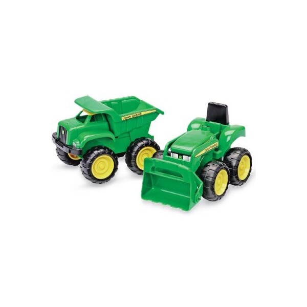 John Deere 2 pack dump truck and tractor Perfect for the sandbox with durable plastic construction and child friendly designs Outfitted with free rolling wheels and fully functional parts moving dump bed and front loader Ideal for children ages 18 Months plus