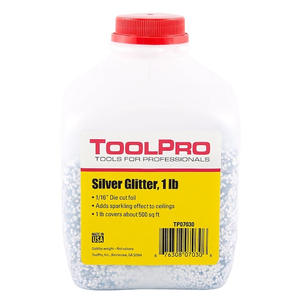 Add a sparkling effect that accents a paint color of any ceiling. May be applied by gun or thrown by hand while wearing safety glasses. Apply to wet or tacky surface.Add glimmer and sparkle to the topcoat of any ceiling.1/16 in. die cut foil.Silver color.1 lb. covers 500 sq. ft.