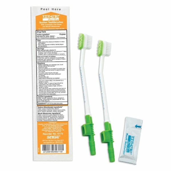 Includes 2 suction toothbrushes with sodium bicarbonate, 7 mL of antiseptic oral rinse, and a 2 gram pouch of mouth moisturizer Connects directly to standard suction lines to help remove dental plaque, debris, and oral secretions Thumb port provides easy suction control Angled handles provide more thorough cleansing of the back of the oral cavity