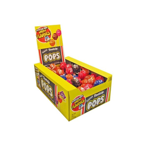 Tootsie roll tootsie pops, 0.6 oz., assorted flavors, 100/box tasty tootsie pops have a chewy chocolatey center covered in a delicious, hard candy coating. A simple, delicious treat and only 60 calories per pop. Fat free. Nut and gluten free pops. Pops come in a variety of fun flavors.. this product arrives to most customers in 2-3 business days.