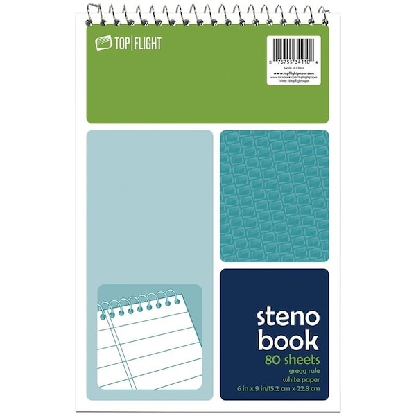 Steno Pad, Rule Sheet, 6 in L x 9 in W Sheet, 80Sheet, White Sheet, Wirebound Binding
