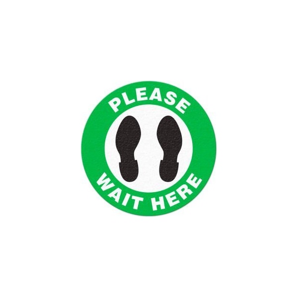 PLEASE WAIT HERE, ADHESIVE FLOOR SIGN, 17" DIAMETER CONSTRUCTED FROM A HIGH QUALITY ADHESIVE VINYL, WE LAMINATE A THICK TEXTURED VINYL TO THESE SIGNS FOR ADDED DURABILITY AS WELL AS SLIP RESISTANCE. THE SUB-SURFACE PRINTED IMAGES PROVIDE EXTENDED DURABILITY AND WILL STAND UP TO HEAVY PEDESTRIAN TRAFFIC. THE AGGRESSIVE ADHESIVE WILL ADHERE TO MOST SMOOTH, CLEAN AND DRY FLOORS.