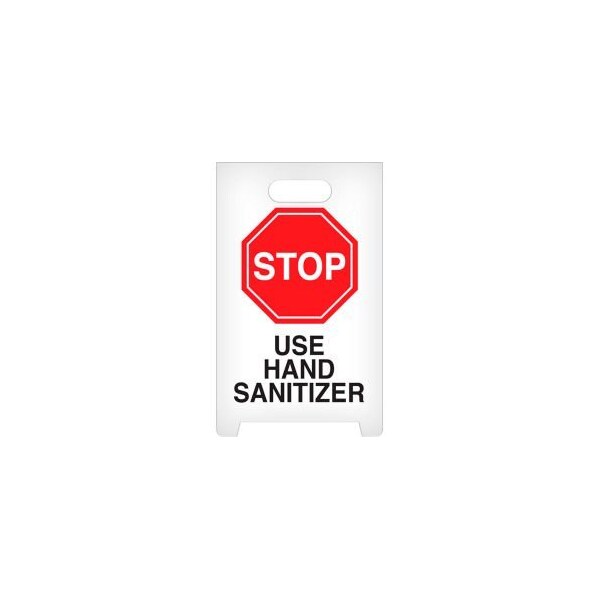 STOP USE HAND SANITIZER A-FRAME FLOOR SIGN THE A-FRAME STANDING FLOOR SIGN IS THE BEST WAY TO GIVE A CLEAR WARNING OF A TEMPORARY HAZARD OR COMMUNICATE A MESSAGE TO PEDESTRIAN TRAFFIC. PRINTED BOTH SIDES SO THE MESSAGE IS CLEARLY VISIBLE FORM BOTH DIRECTIONS AND MADE FROM DURABLE LIGHTWEIGHT PLASTIC. THIS DESIGN ALSO ALLOWS THE USER TO COLLAPSE THE SIGN AND LAY FLAT FOR EASY STORAGE WHEN NOT IN USE.