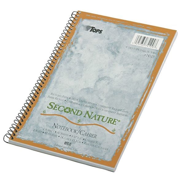 - TOPSTM Second Nature® Recycled 1-Subject Notebooks have paper made from recycled fiber. A sturdy no-snag coil resists catching on backpacks, papers or clothing. Perforated sheets detach easily to keep your book neat and tidy.