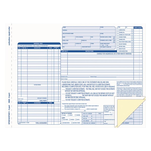 Auto Repair Four-Part Order Form, 8.5 x 11, Four-Part Carbonless, PK50 (Discontinued)