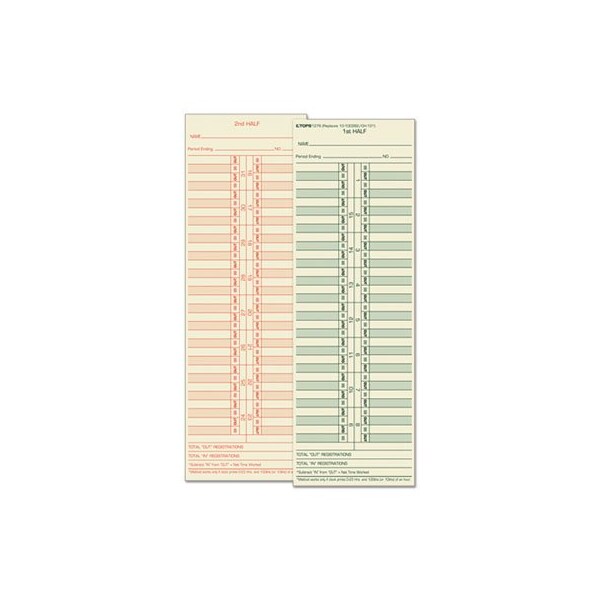 Equivalent to time clock manufacturer's time cards. 143 lb tag stock. Manila Stock Printed Green on FrontWith total inoutin and ininin registration lines. Prints red on back. Size: 3.5 x 10.5; Time Period: Semi-Monthly; Printing Sides: Two Sides; Card Quantity: 500.