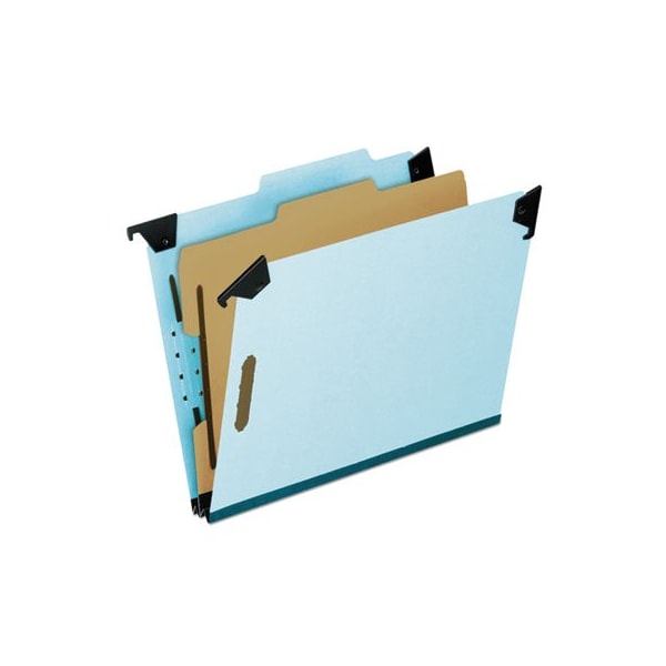 Keep related records in one hanging folder for faster referencing. Specially designed for managing projects, related papers can easily classified into different sections. Pivoting hangers fold down for carry-along convenience. 1in-capacity fasteners on both sides of 20 pt. pressboard dividers and inside both 25 pt. pressboard covers. Expandable reinforced rip-proof tape gusset bottom. 2/5 cut tabs, right of center. Folder Size Type: Letter; Max Folder Expansion: 2in; Folder Color: Blue; Color Family: Blue.