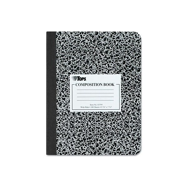 Tops composition book w/ black hard cvr 63795, 9-3/4" x 7-1/2", white, 100 sheets/pack sturdy hard cover protects the contents and endures daily wear and tear. Center sewn sheets stay permanently fastened in the book. Light blue ruling on both sides of white sheets provide ample space for notes. larger quantity quotes available. Please call 1-888-978-7759. this product arrives to most customers in 2-3 business days.