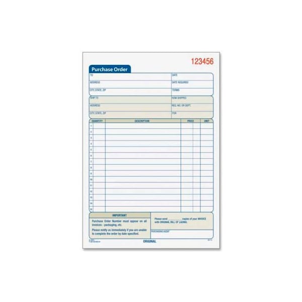 Tops purchase order book, 2-part, carbonless, 5-9/16" x 7-15/16", 50 sets/pack purchase order book offers ample space for listing up to 12 items and a carbonless two-part design. Duplicate format includes originals in white and duplicates in canary. Each form offers spaces for recipient's name, address, shipping address, date, date required, shipping method, terms of shipment, and name of purchasing agent. The list of 12 items allows you to list quantity, product description, price and unit. Wraparound back cover prevents "write through." detached form measures 5-9/16" x 7-15/16". Book contains 50 sets. larger quantity quotes available. Please call 1-888-978-7759. this product arrives to most customers in 2-3 business days.