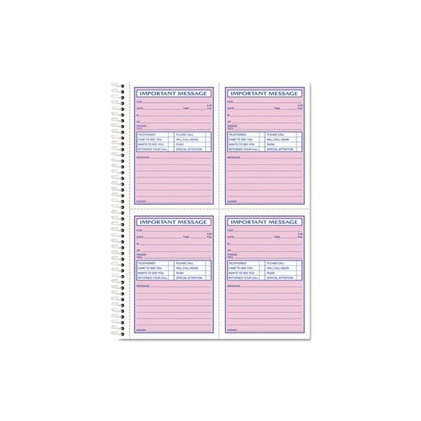 Quick check-off style with special area for fax and mobile phone numbers. Space for important phone numbers. Two-part carbonless copies remain in book as permanent record. Value PackStock Up and Save! Form Type Details: Memo/Message; Dated/Undated: Undated; Forms Per Page: 4; Forms Per Page Layout: Horizontal/Vertical: Two Across, Two Down.