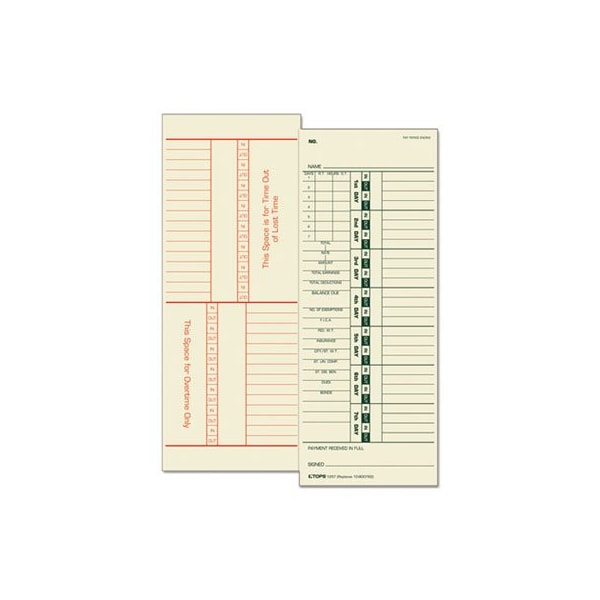 Equivalent to time clock manufacturer's time cards. 143 lb tag stock. Manila Stock Printed Green on FrontWith area to calculate regular hours, extra hours, deductions, gross and net pay per week. Prints red on back. Size: 3.5 x 9; Time Period: Weekly; Printing Sides: Two Sides; Card Quantity: 500.