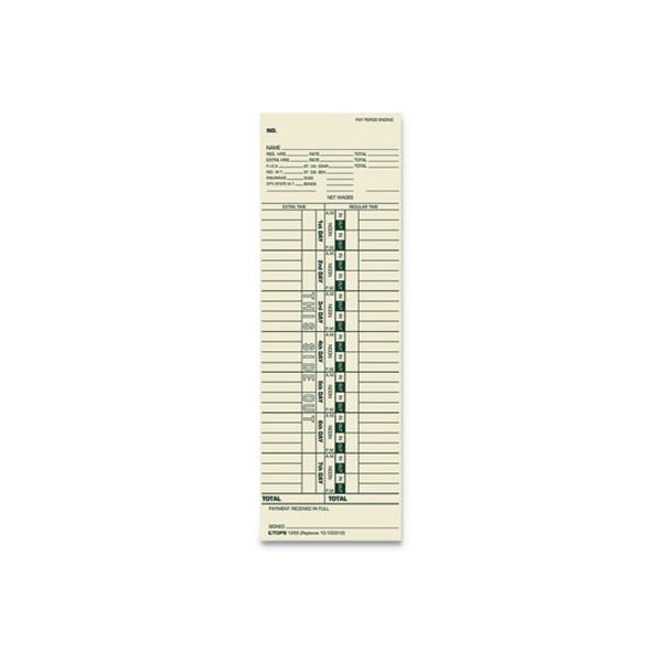 Equivalent to time clock manufacturer's time cards. 143 lb tag stock. Manila Stock Printed Green on FrontWith employee-verification signature line. Size: 3.5 x 10.5; Time Period: Weekly; Printing Sides: One Side; Card Quantity: 500.