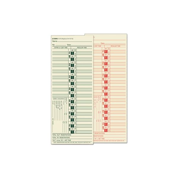 Equivalent to time clock manufacturer's time cards. 143 lb tag stock. Manila Stock Printed Green on FrontWith area to calculate regular hours, extra hours, deductions, gross and net pay per week. Prints red on back. Size: 3.5 x 9; Time Period: Bi-Weekly; Printing Sides: Two Sides; Card Quantity: 500.