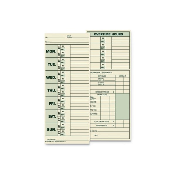 Equivalent to time clock manufacturer's time cards. 143 lb tag stock. Manila Stock Printed Green on FrontPrinted green on back. Size: 3.5 x 8.5; Time Period: Weekly; Printing Sides: Two Sides; Card Quantity: 500.