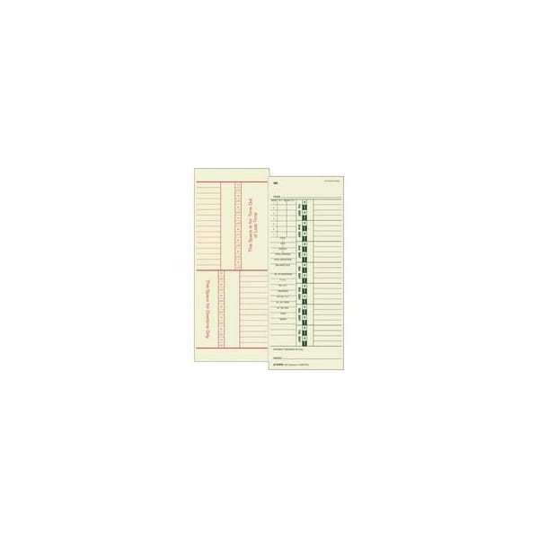 Two-sided time cards feature numbered days, full payroll calculations, and pay receipt. Front shows numbered days, full payroll calculations printed in green ink with the back side for overtime, and lost time hours printed in red. Extra-heavy material is made of 143 lb. manila stock. Time cards replace 10-800762 and 1950-9308 and are designed for use with Acroprint 125R, 150R, ES700, ES900, ESP180, 175TR; Cincinnati 1000, 10000; Lathem 900E, 1200, 1500E, 2000, 4000, 5000EP; Simplex KCF, KCG, JCG, JCP and 2500.