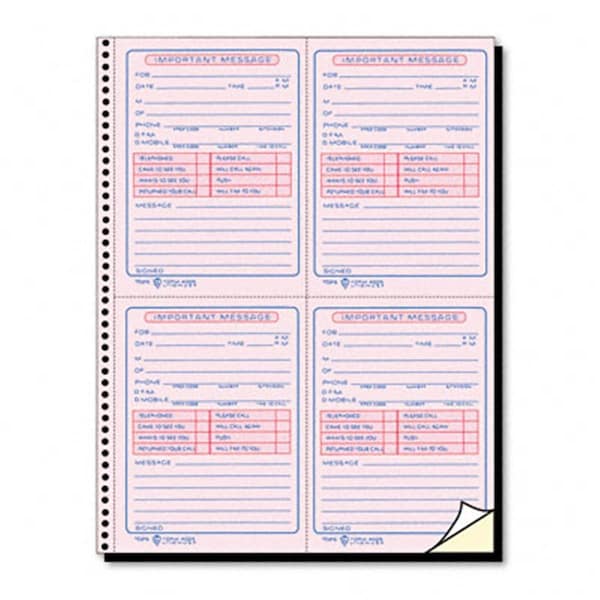 Quick check-off style with special area for fax and mobile phone numbers. Space for area codes and important phone numbers. Copies remain in book as permanent record. Form Size W x H: 3 7/8 in x 5 1/2 in. Format: 200-Set Book. Sold as 1 each.