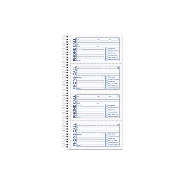 Coil-locked wire binding, vinyl coated. Stop card prevents write-through. Black-print carbonless duplicates remain bound in book for permanent record. Date register on front cover. Form Type Details: Memo/Message; Dated/Undated: Undated; Forms Per Page: 4; Forms Per Page Layout: Vertical: Four Down.