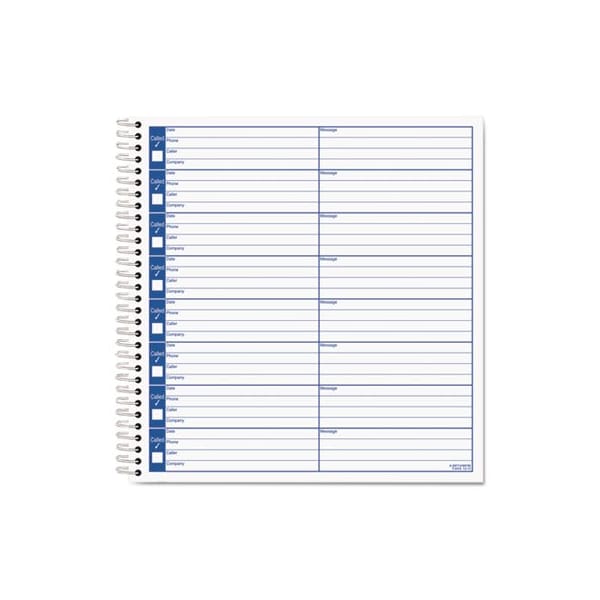 Slim spiralbound books conserve space; tote in briefcase, time management organizer or glove compartment. Provides accurate log of retrieved messages. Handy check-off box indicating returned messages, providing a quick visual reminder of pending work. Printed on heavyweight bond to prevent bleed-through. Date register on front cover. Form Type Details: Memo/Message; Dated/Undated: Undated; Forms Per Page: 8; Forms Per Page Layout: Vertical: Eight Down.