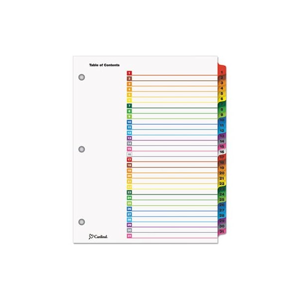 Cardinal OneStep Table of Contents Dividers help you create an index system instantly. Matching, preprinted tabs on the divider sheets can be used in either vertical or landscape formats. Tab sets have coordinating Table of Content sheets. Easy to use, free templates in your favorite software are available online; details on packaging. Tabs and ring edges are reinforced to withstand heavy use. Laser and inkjet compatible. Three-hole punched and sized for 8.5in x 11in sheets. Index Divider Style: Arabic Numeric; Index Divider Size: 11 x 8.5; Punched/Unpunched: 3-Hole Punched; For Use With: Ring Binders.