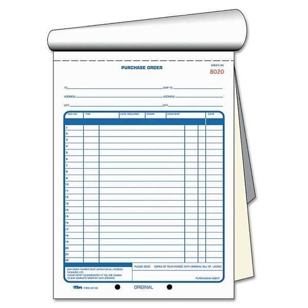 Purchase Order Book, Length 11 in, Number of Duplicates 2-Part Carbonless, Carbon Copies Yes, Width 8 3/8 in, Includes Consecutively numbered purchase orders and numbered lines help with record keeping. 22 Lines, Number of Sheets 50, Paper Color Blue, White