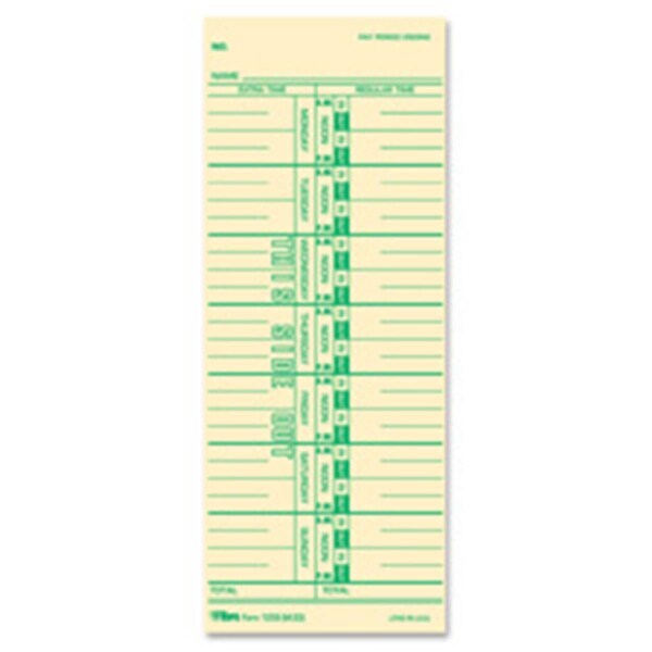 Weekly time cards are equivalent to cards from time clock manufacturers. Format includes named days. Left side of card is for extra time and the right side for regular time. Front side is printed in green ink. Extra-heavy material is made of 143 lb. manila stock. Time cards replace 10-800292 M-33 33 and 1950-9305 and are designed for use with Acroprint 125R 150R ES700 ES900 ESP180 175TR; Cincinnati 1000 10000; IBM right-edge printing clocks; Lathem 4000 Series; Simplex KCF KCG JCG JCP and 2500.