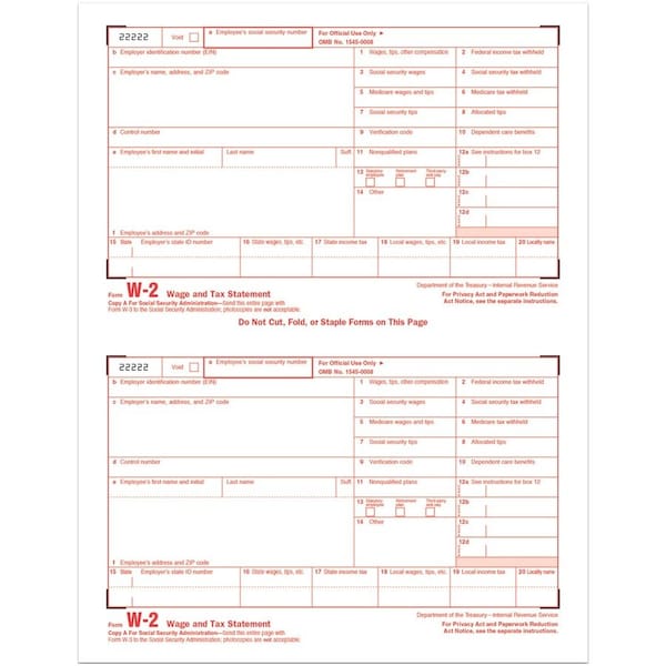Six-part tax kit includes 24 W-2 forms that meet IRS specifications, 24 gummed envelopes and one Laser W-3 Summary Transmittal Form. W-2 forms are used to report wages and deductions to the Social Security Administration. 20 lb., letter-size white paper is compatible with laser printers. Detached size is 5-1/2" x 8-1/2" with two forms per sheet.