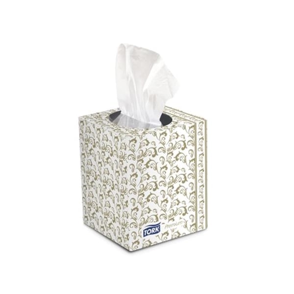 Premium facial tissue; Cube box; White; 2-Ply; Sheet size: 8.2" x 7.9"; 94 tissues/box; 36 boxes/case; Box dimensions: 4.3" x 4.4" x 5.25"; Poly-shield; Replaces SCA TF6910