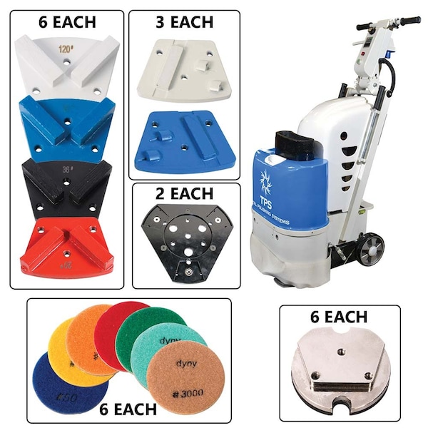 Total Polishing Systems TPSX1KITQPNO (TPS X1 Floor Preparation Machine) with 6 ea Diamond Grinding Blocks, Traps, Pcd, Polishing Pads w / Magnectic Adapter + Q Plate.The total polishing systems TPSX1 machine gives you the ability to polish, grind or texture concrete floor or prepare surfaces. This is the perfect tool for sidewalk grinding, trip hazard removal, and floor leveling. The TPS-X1 is great for residential and small commercial projects alike and is commonly used for bathrooms, kitchens, and closets. With a grinding width of 20” and adjustable speed up to 1,500 RPM the X1 can grind 1/32” of material at a rate of 400-750 sq. feet per hour.