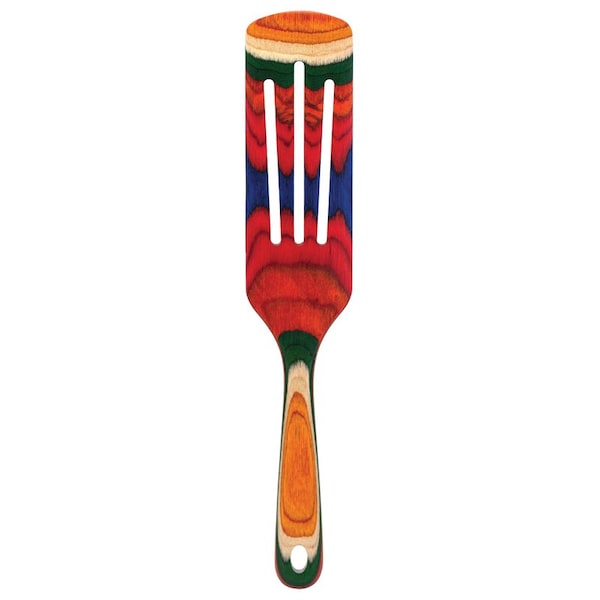Add a splash of warming color to your kitchen with the Baltique Marrakesh Collection Spurtle. This eye-catching utensil is masterfully crafted from layers of colored birched wood to create a gorgeous color array. The Marrakesh Collection features a rainbow blend of red, green, orange, blue and natural wood colors. The colorway was inspired by the bright and colorful marketplaces of Morocco. The Spurtle is a versatile tool in the kitchen for both cooking and serving. At 13 inches long it provides ample length to get to the deepest of pots for stirring. It's long slim profile is great for serving as well. It features three slots in the serving tool. Includes a convenient hanging hole for easy storage and display. Pair the Spurtle with the other utensils in the Marrakesh Collection for a bright bouquet of color in your kitchen.