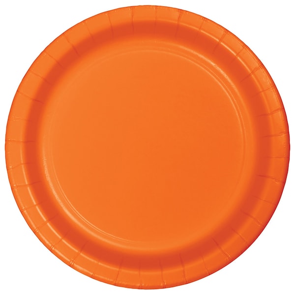 Get ready to serve delicious appetizers, snacks, or desserts to party guests with the Sunkissed Orange Dessert Plate. The 7" round paper plate is the ideal size for a slice of cake, and the orange color makes a lovely addition to printed theme supplies and decorations. Sold in quantities of 240, these disposable plates are an ideal complement to the tableware at any number of year-round events.