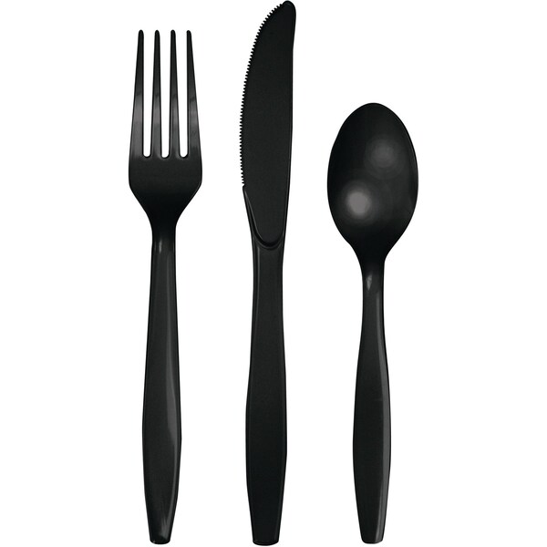 Give your guests a premium dining experience that matches your party color atmosphere with the Black Cutlery Assortment. This elegant cutlery set comes with 8 forks, 8 spoons, and 8 knives. Sold in packages of 288, these heavyweight plastic utensils will bring a unique touch to your table setting.
