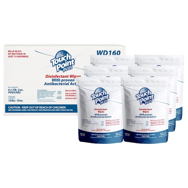 POWERFUL GERM-KILLING FORMULA: Touch Point Plus disinfecting wipes kill 99.9% of bacteria in just 15 seconds, including the SARS-CoV-2 virus, the cause of COVID-19 on hard, non-porous, non-food surfaces. Touch Point Plus also kills up to 45 pathogens, including Human Coronavirus, Cold and Flu Viruses, Norovirus, HIV-1, Staph, MRSA, E. Coli, and Strep. This fast-acting formula starts cleaning on contact.SAFE AND GENTLE ON ALL SURFACES: Touch Point Plus Disinfectant Wipes are versatile and safe for various environments, including industrial, fitness, office, retail, and educational settings. Use where water access is limited. Sanitize high-traffic areas like fitness equipment, desks, and electronics. Keep retail spaces and educational facilities germ-free. Trust Touch Point Plus Disinfectant Wipes for a clean and healthy environment.EASE OF USE CONVENIENCE: Touch Point Plus Disinfectant Wipes in this handy pop-up dispenser bucket simplify your cleaning routine. With their pre-moistened formula, you can skip the hassle of additional cleaning solutions or water. Just grab a wipe and swipe it across the desired surface. Whether you're at home, in the office, or on the go, the compact and portable packaging ensures that these wipes are always within reach.MULTI-PURPOSE VERSATILITY: These multi-purpose wipes can be used in various settings, from homes and offices to schools and retail spaces. They are perfect for disinfecting a wide range of surfaces, including countertops, desks, electronics, gym equipment, and more. Whether you need to sanitize high-traffic areas or wipe down commonly touched objects, Touch Point Plus Disinfectant Wipes deliver exceptional performance.ON-THE-GO-PROTECTION: When you're on the go, Touch Point Plus Disinfectant Wipes provide quick and effective cleaning. Simply pop a wipe from the compact packaging and clean surfaces such as doorknobs, shopping carts, or restaurant tables. The pre-moistened wipes eliminate the need for water or additional cleaning solutions, making them ultra-convenient. With Touch Point Plus Disinfectant Wipes, cleanliness and peace of mind are just a swipe away wherever your travels take you.CASE OF 960 WIPES - Includes six pouches of 160 disinfectant wipes.OPTIONAL ACCESSORIES - Compatible with Touch Point 1005FT Flip Top Wall / Pole Mount Dispenser and C9STN Pole Stand for Dispensers.