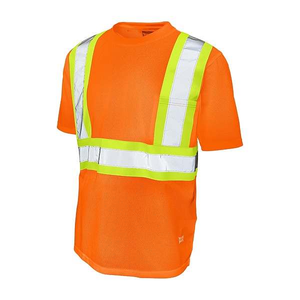 High Visibility Short Sleeve Shirt, Gender Men's, ANSI Class 2, Shirt Style T-Shirt, Material Polyester, Number of Outside Pockets 1, Color Orange, Size S, Fabric Weight 3.67 oz, Standards ANSI, Sleeve Type Short, Maximum Chest Size 37 in, ANSI Type R, Features Polyester Micro Mesh with Wicking Treatment, Length 29 1/2 in, Minimum Chest Size 35 in, Moisture-Wicking Yes, Pocket Locations Chest