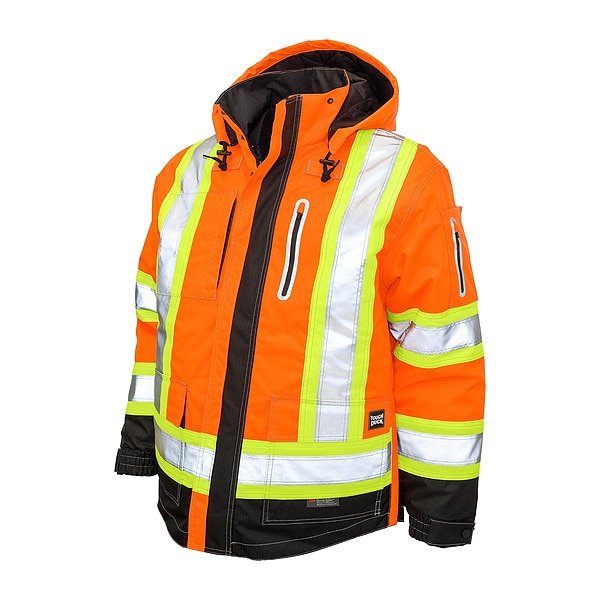High Visibility Parka, Style Parka Jacket, ANSI Class 3, ANSI Type R, Gender Men's, Front Closure Type Zipper and Snaps, Color Orange, Size 2XL, Number of Outside Pockets 6, Maximum Chest Size 51 in, Material Polyester, Standards ANSI 107-2015 Type R, Class 3, Minimum Chest Size 49 in, Insulated for Cold Conditions Yes, Fabric Weight 300 den, Features Breathable, Waterproof